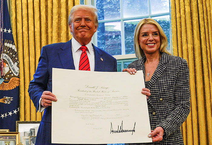 3 เมษายน 2569 สำนักข่าวต่างประเทศรายงานว่า โดนัลด์ ทรัมป์ ผู้นำสหรัฐฯ สั่งปลด แพม บอนดิ ออกจากตำแหน่งรัฐมนตรียุติธรรม เมื่อวันพฤหัสบดี (2 เม.ย.) ท่ามกลางความไม่พอใจต่อผลงานที่สะสมมาอย่างต่อเนื่อง โดยเฉพาะกรณีการจัดการเอกสารคดีของ เจฟฟรีย์ เอปสตีน ซึ่งกลายเป็นประเด็นอ่อนไหวทางการเมือง
