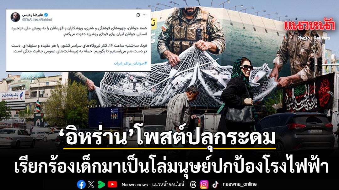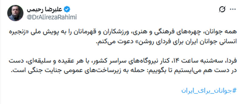 อาลิเรซา ราฮิมิ ได้โพสต์ข้อความผ่านทางแพลตฟอร์มเอ็กซ์ "@DrAlirezaRahimi" ระบุว่า " ผมขอเชิญชวนเยาวชนทุกคน นักกีฬา ศิลปิน นักเรียน นักศึกษา และอาจารย์มหาวิทยาลัย มารวมตัวกัน ข้าร่วมแคมเปญระดับชาติ ห่วงโซ่มนุษย์เยาวชนอิหร่านเพื่ออนาคตของอิหร่าน ขอให้มารวมกันเวลา 14.00 น. ของวันที่ 7 เม.ย. (ตามเวลาท้องถิ่น) รอบโรงไฟฟ้าซึ่งเป็นทรัพย์สินและทุนของชาติของเรา ไม่ว่าจะมีมุมมองทางการเมืองอย่างไรก็ตาม โรงไฟฟ้าเหล่านี้เป็นของอนาคตของอิหร่านและเยาวชนอิหร่าน"