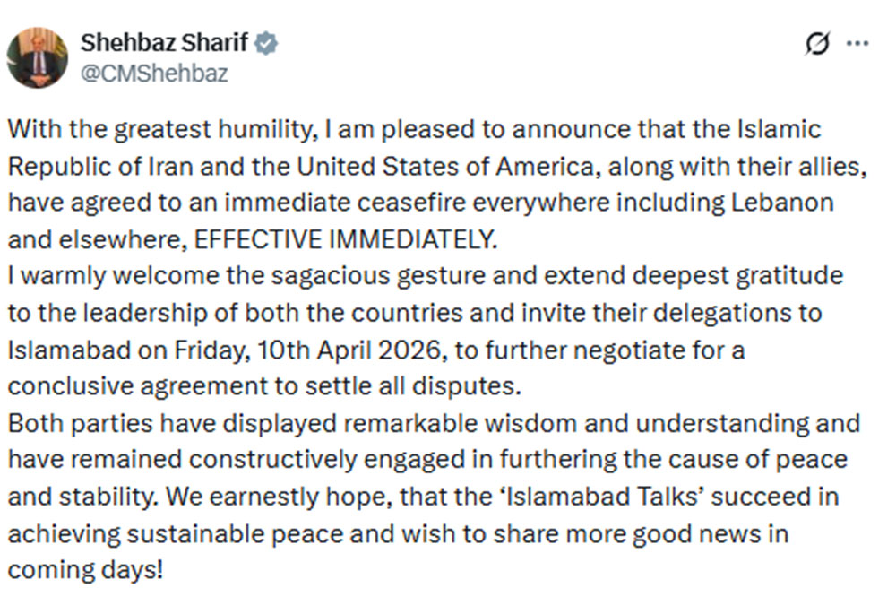 ข้าพเจ้ายินดีเป็นอย่างยิ่งต่อท่าทีอันชาญฉลาดนี้ และขอแสดงความขอบคุณอย่างสุดซึ้งต่อผู้นำของทั้งสองประเทศ และขอเชิญคณะผู้แทนของทั้งสองประเทศมายังกรุงอิสลามาบัดในวันศุกร์ที่ 10 เมษายน 2569 เพื่อเจรจาต่อรองเพิ่มเติมเพื่อหาข้อตกลงที่เด็ดขาดในการยุติข้อพิพาททั้งหมด