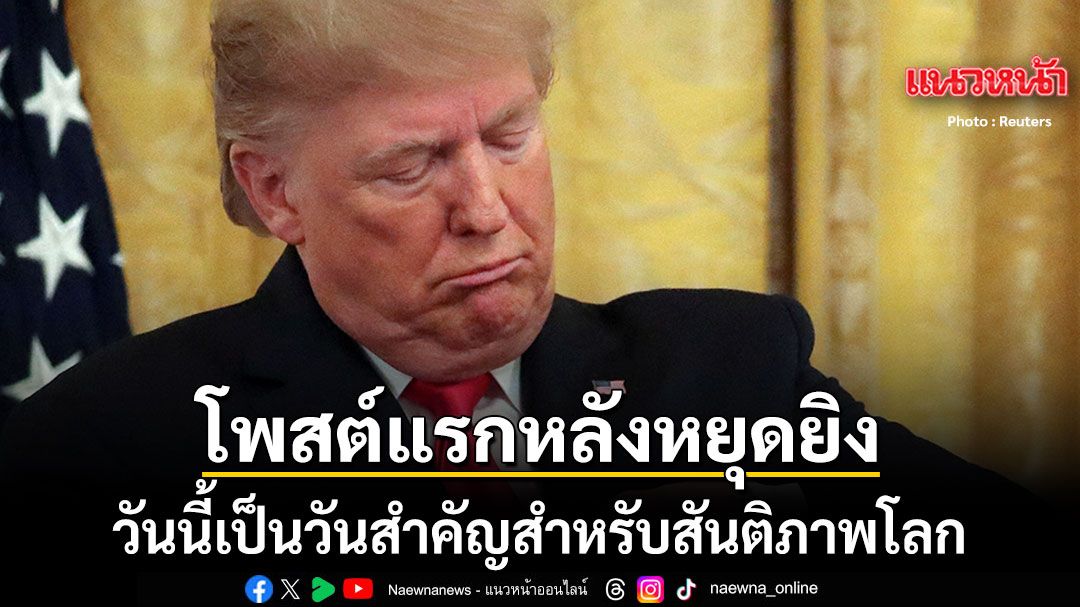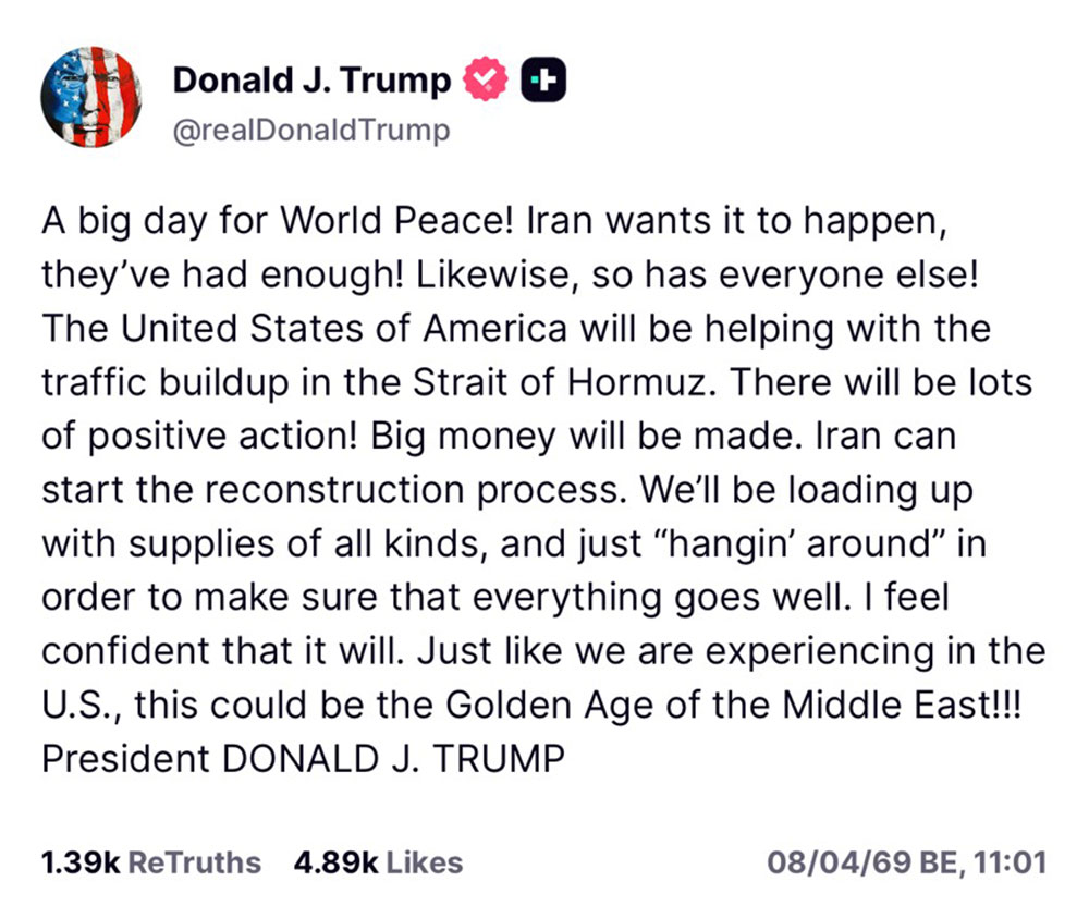 8 เมษายน 2569 สำนักข่าวต่างประเทศรายงานว่าประธานาธิบดีโดนัลด์ ทรัมป์ ของสหรัฐฯ ได้ออกมาโพสต์ข้อความผ่านทางทรูธ โซเชียล "@RealDonaldTrump" ระบุข้อความว่า "เป็นวันสำคัญสำหรับสันติภาพโลก! อิหร่านต้องการให้มันเกิดขึ้นพวกเขาทนมามากพอแล้ว! เช่นเดียวกัน ประเทศอื่นๆ ก็เช่นกัน!