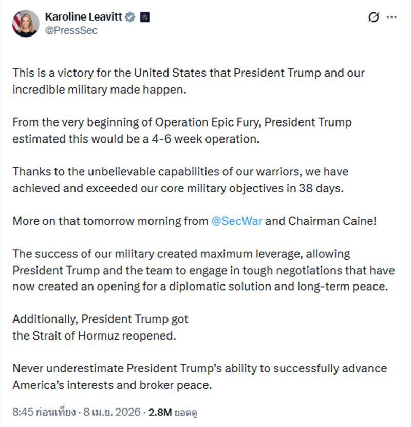 8 เมษายน 2569 สำนักข่าวต่างประเทศรายงานว่า นางแคโรไลน์ เลวิตต์ (Karoline Leavitt) โฆษกทำเนียบขาว ได้ออกมาโพสต์ข้อความผ่านทางเอ็กซ์ "@PressSec" ระบุข้อความว่า นี่คือชัยชนะของสหรัฐอเมริกาซึ่งประธานาธิบดีทรัมป์ และกองทัพอันยอดเยี่ยมของเราได้ร่วมกันทำขึ้น ประธานาธิบดีทรัมป์ได้ทำให้ช่องแคบฮอร์มุซ กลับมาเปิดอีกครั้ง