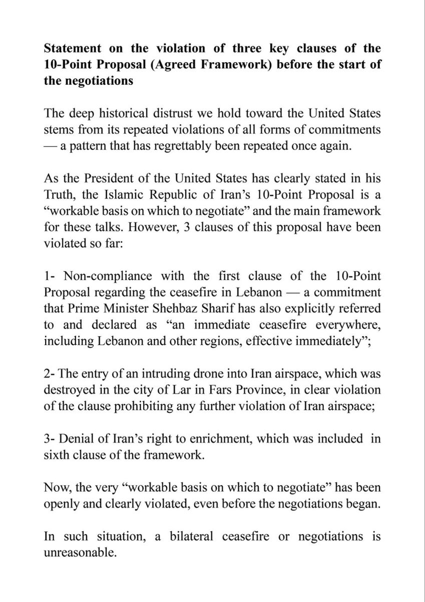 9 เมษายน 2569 สำนักข่าวต่างประเทศรายงานว่า 'โมฮัมหมัด บาเกอร์ กาลิบาฟ' ประธานรัฐสภาอิหร่าน ออกมาโพสต์ข้อความผ่านทางโซเชียล "@mb_ghalibaf" ระบุข้อความว่า คำแถลงเกี่ยวกับการละเมิดข้อกำหนดสำคัญ 3 ประการของข้อเสนอ 10 ข้อ (กรอบความตกลง) ก่อนการเริ่มต้นการเจรจา