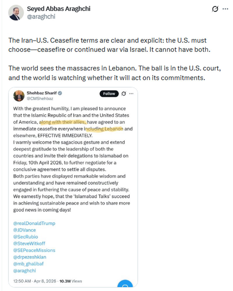 9 เมษายน 2569 สำนักข่าวต่างประเทศรายงานว่า นายอับบาส อารักชี รัฐมนตรีว่าการกระทรวงการต่างประเทศของอิหร่าน ได้ออกมาโพสต์ข้อความผ่านทางเอ็กซ์ "@araghchi" โดยได้แคปเจอร์โพสต์ของทางนายกฯปากีสถาน เชห์บาซ ชารีฟ ที่เป็นตัวกลางในการไกล่เกลี่ยในครั้งนี้ พร้องได้ไฮไลน์ข้อความ "สาธารณรัฐอิสลามอิหร่านและสหรัฐอเมริกา พร้อมด้วยพันธมิตร ได้ตกลงที่จะหยุดยิงทันทีในทุกพื้นที่ รวมถึงเลบานอนและที่อื่นๆ โดยมีผลบังคับใช้ทันที" พร้อมระบุข้อความว่า ...