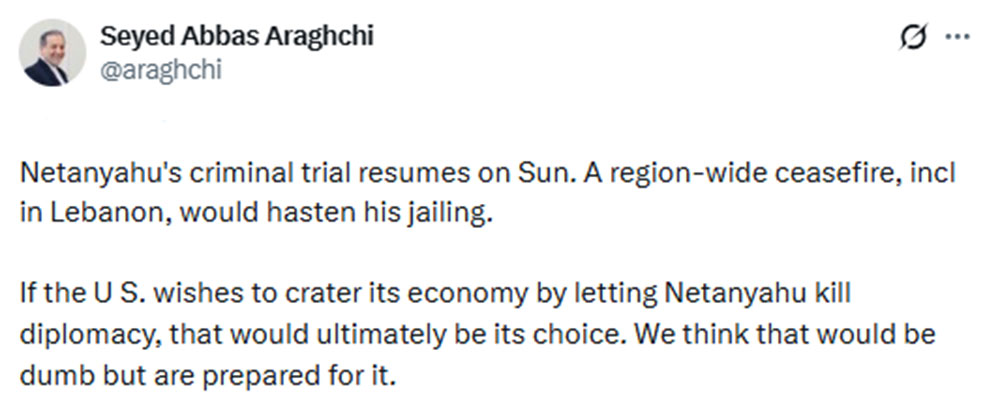 10 เมษายน 2569 สำนักข่าวต่างประเทศรายงานว่า นายอับบาส อารักชี รัฐมนตรีกระทรวงต่างประเทศของอิหร่าน ได้ออกมาโพสต์ข้อความผ่านทางเอ็กซ์ "@araghchi" ระบุข้อความว่า "การพิจารณาคดีอาญาของ เนทันยาฮู จะกลับมาดำเนินต่อในวันอาทิตย์ การหยุดยิงทั่วทั้งภูมิภาค รวมถึงในเลบานอน จะช่วยเร่งให้เขาถูกจำคุก