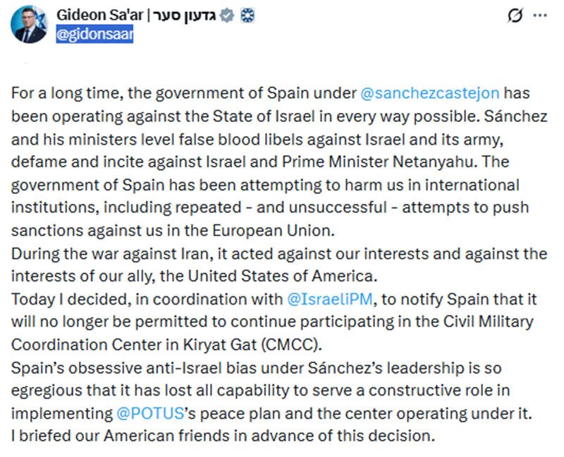โดยเขาเขียนบนเอ็กซ์ "@gidonsaar"ว่า "อคติที่ต่อต้านอิสราเอลอย่างรุนแรงของสเปนภายใต้การนำของซานเชซนั้นร้ายแรงมาก จนทำให้สเปนสูญเสียความสามารถที่จะมีบทบาทสร้างสรรค์ในการดำเนินการตามแผนสันติภาพของประธานาธิบดีสหรัฐฯ และศูนย์กลางที่ดำเนินการภายใต้แผนดังกล่าว"