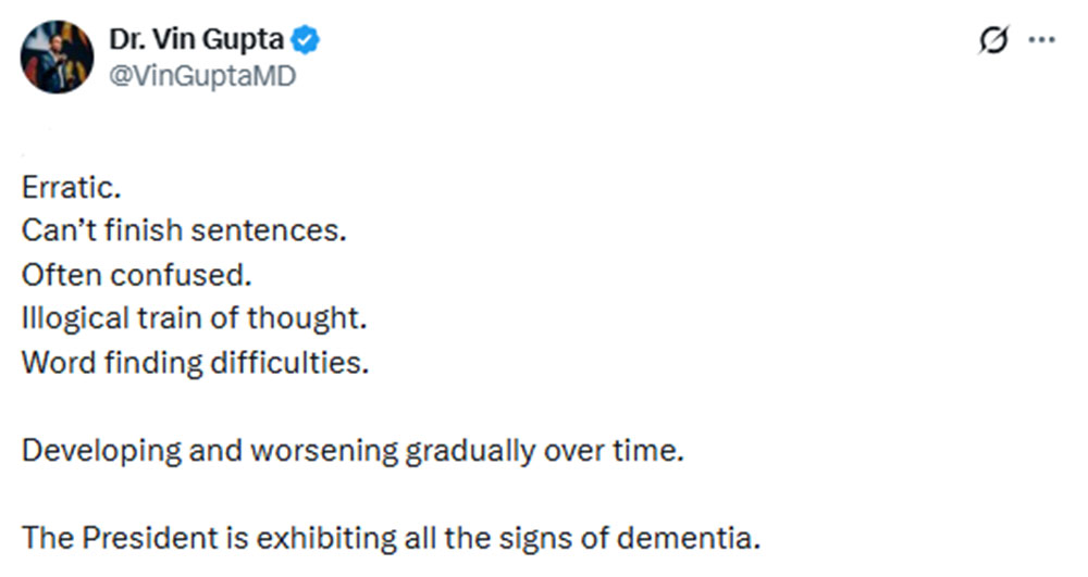 โดยก่อนหน้านี้ ดร.วิน คุปตะ นักวิเคราะห์ทางการแพทย์ ได้ออกมาโพสต์ข้อความผ่านทางเอ็กซ์ส่วนตัว "@VinGuptaMD" ระบุว่า โดนัลด์ ทรัมป์ มีอาการสมองเสื่อม เพราะเขาเริ่มพูดจาไม่ต่อเนื่อง พูดไม่จบประโยค สับสน ความคิดไม่สมเหตุสมผล หาคำพูดที่เหมาะสมไม่ได้ และอาการค่อยๆ แย่ลงเรื่อยๆ