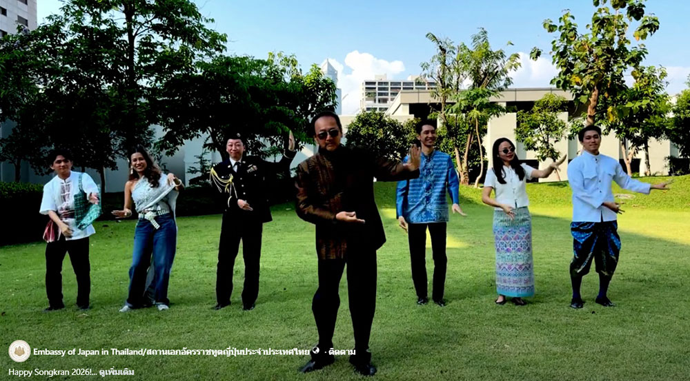 เริ่มต้นที่ สถานเอกอัครราชทูตญี่ปุ่นประจำประเทศไทย ได้โพสต์คลิปวิดีโอ Happy Songkran 2026! นำทีมโดย นายโอตากะ มาซาโตะ เอกอัครราชทูตญี่ปุ่นประจำประเทศไทยคนปัจจุบัน จำลองเป็นยอดมนุษย์แปลงร่างจากชุดสูททางการ เป็นการ สวมใส่เสื้อผ้าไทย โดยในคลิปผู้ชายสวมเสื้อผ้าไหมไทย ผู้หญิงสวมใส่ผ้าถุงเสื้อลูกไม้ พร้อมเพลงสงกรานต์เป็นภาษาญี่ปุ่น อีกทั้งยังเล่นสาดน้ำกันอย่างสนุกสนาน และอวยพรด้วยว่า "สุขสันต์วันสงกรานต์ ขอให้มีความสุข สุขภาพแข็งแรงตลอดปี"