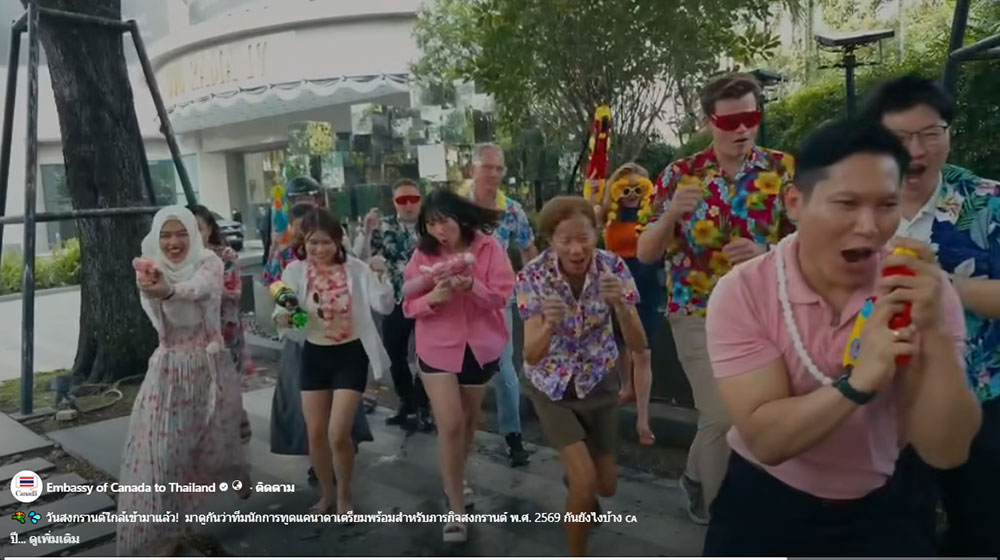 ด้าน สถานเอกอัครราชทูตแคนาดาประจำประเทศไทย (Embassy of Canada to Thailand) ก็ได้ออกมาโพสต์คลิปสุดน่ารักกับภารกิจวันสงกรานต์ของทีมนักการทูตแคนาดา พร้อมแคปชั่น "วันสงกรานต์ใกล้เข้ามาแล้ว! มาดูกันว่าทีมนักการทูตแคนาดาเตรียมพร้อมสำหรับภารกิจสงกรานต์ พ.ศ. 2569 กันยังไงบ้าง ปีนี้เราพร้อมปฏิบัติการแบบเต็มรูปแบบ ไม่ว่าจะเป็น “อาวุธ” ไว้สาดน้ำ น้ำหวานเพิ่มพลัง หรือชุดลายดอกเพื่อเตรียมรบ โดยเป้าหมายของเราคือการสนุกให้เต็มที่ที่สุด! มาร่วมเฉลิมฉลองความงดงามของวัฒนธรรมไทยไปด้วยกัน