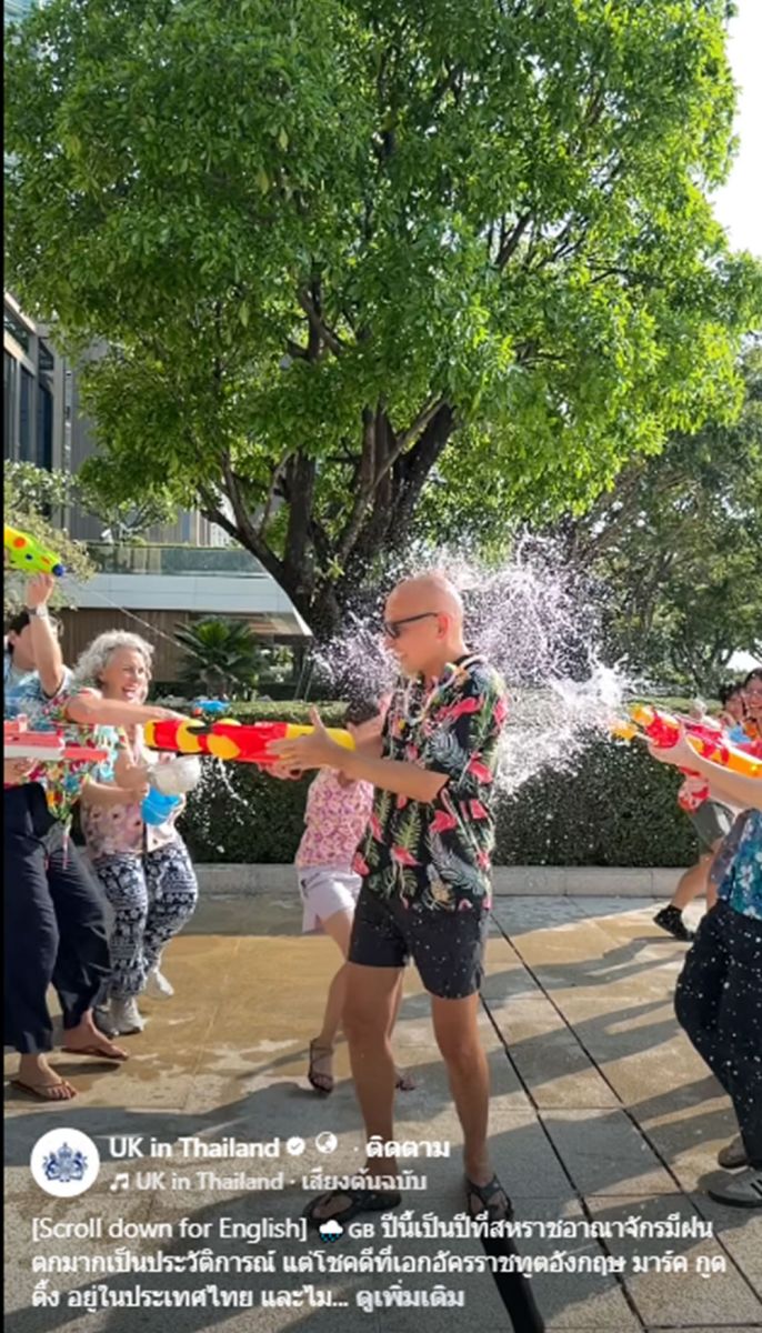 สถานเอกอัครราชทูตสหราชอาณาจักร ประจำประเทศไทย ได้จัดทำวีดีโอคลิปเริ่มต้นด้วย นายมาร์ค กูดดิ้ง เอกอัครราชทูตอังกฤษประจำประเทศไทย กล่าวเป็นภาษาไทยว่า "ปีนี้ในอังกฤษฝนตกมากกว่าปกติ แต่ผมอยู่ที่ประเทศไทย ไม่ต้องกลัวเปียก" ก่อนที่นายมาร์ค กูดดิ้ง จะโยนร่มทิ้งเปลี่ยนชุดเป็นเสื้อลายนกฟลามิงโก้ ถือปืนฉีดน้ำ เล่นน้ำสงกรานต์อย่างสนุกสนาน ปิดท้ายคำอวยพรว่า "สุขสันต์วันสงกรานต์ และสวัสดีปีใหม่ไทย ขอให้ทุกคนมีความสุขและความเจริญ"