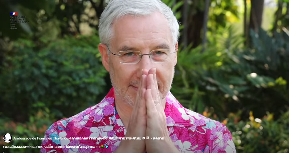 เฟซบุ๊กของ Ambassade de France en Thaïlande สถานเอกอัครราชทูตฝรั่งเศสประจำประเทศไทย ได้ออกมาโพสต์คลิปของ นายฌ็อง-โกลด ปวงเบิฟ เอกอัครราชทูตฝรั่งเศสประจำประเทศไทย สวมเสื้อลายดอกสีชมพูบานเย็น พร้อมพูดเป็นภาษาไทยว่า "สงกรานต์เป็นเทศกาลสำคัญของไทย มาสนุกไปกับวัฒนธรรม 4 ภาคกันครับ" พร้อมสืบสานประเพณีรดน้ำดำหัวของประเทศไทย อีกทั้ง เอกอัครราชทูตฝรั่งเศสประจำประเทศไทย ยังได้พูดเป็นภาษาไทยของทั้ง 4 ภาคอีกด้วย