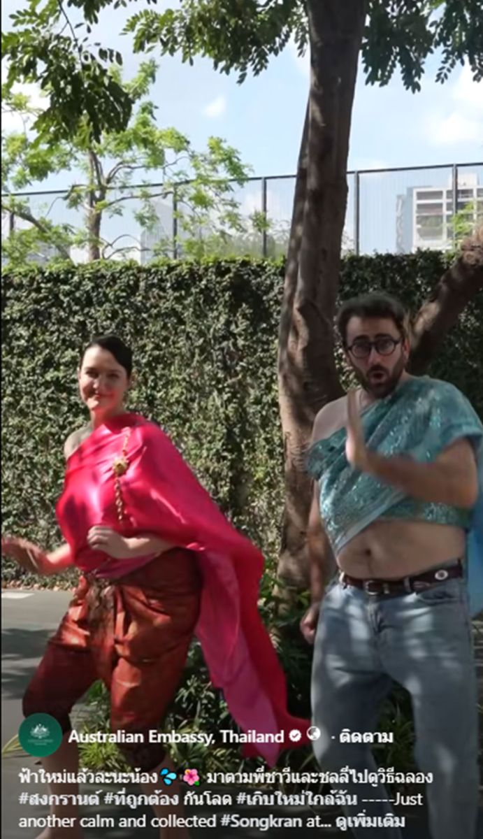 ในส่วนของ ส่วนสถานเอกอัครราชทูตออสเตรเลียประจำประเทศไทย ก็ไม่น้อยหน้า ได้ออกมาทำคลิปแสดงบทบาทของชลลี่ และ พี่ชาวี ในซีรีส์ของประเทศไทยอย่าง "น้ำตากามเทพ" ที่เป็นวลีฮิตในโซเชียลอย่างคำว่า " พี่ชาวี พี่จะใส่สูทมาทำไม?" ก่อนที่ฝ่ายชายจะมีการแปลงร่างเป็นชุดสไบ แต่นุ่งกางเกงยีนส์ ตามคลิปไวรัล พร้อมเต้นประกอบเพลง Bangkok City ก่อนที่จะมีการบอกว่าใส่ชุดนี้ไปไหว้ผู้ใหญ่ไม่ได้ สุดท้ายฝ่ายชายก็หมุนเปลี่ยนชุดเป็นชุดราชปะแตนสีน้ำเงิน ก่อนจะพากันไปรดน้ำดำหัวเพื่อไหว้ผู้ใหญ่ ปิดท้ายด้วยการเล่นน้ำสงกรานต์ ก่อนที่จะมีการล้อเล่น รองเท้าแตะกินเท้า ก่อนที่ ดร.แอนเจลา แมคโดนัลด์ พีเอสเอ็ม เอกอัครราชทูตออสเตรเลียประจำประเทศไทย กล่าวว่า สงกรานต์นี้เล่นน้ำด้วยความระมัดระวังนะคะ และขอให้ชาวไทยทุกท่าน มีความร่มเย็นเป็นสุขและสมหวังในทุกสิ่ง