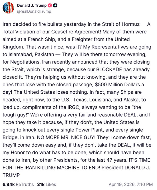 19 เมษายน 2569 สำนักข่าวต่างประเทศรายงานว่า โดนัลด์ ทรัมป์ ประธานาธิบดีสหรัฐ โพสต์ข้อความผ่านแพลตฟอร์ม Truth Social กล่าวหาอิหร่านว่าเป็นฝ่ายละเมิดข้อตกลงหยุดยิง หลังมีการยิงกระสุนในบริเวณ ช่องแคบฮอร์มุซ โดยระบุว่า กระสุนหลายลูกพุ่งเป้าไปยังเรือของฝรั่งเศสและเรือบรรทุกสินค้าจากสหราชอาณาจักร