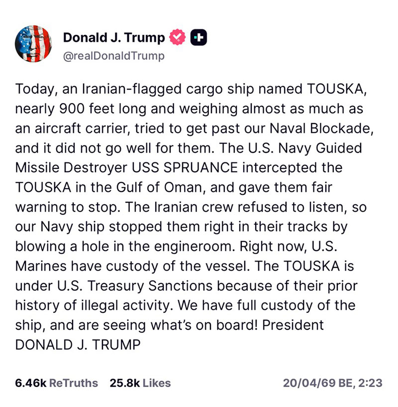20 เมษายน 2569 สำนักข่าวต่างประเทศรายงานว่า ประธานาธิบดีโดนัลด์ ทรัมป์ ของสหรัฐฯ ได้ออกมาโพสต์ข้อความผ่านทรูธ โซเชียล "@RealDonaldTrump" ยืนยันเรือพิฆาตติดจรวดขีปนาวุธกองทัพเรือสหรัฐ ยูเอสเอส สปรูเอนซ์ (USS Spruance) ได้ยิงจรวดใส่บริเวณห้องเครื่องยนต์ของเรือสินค้าอิหร่าน ทุสกา (Touska) ขนาดความยาว 900 ฟุต ในอ่าวโอมานจนเสียหายและเข้ายึดเรือ
