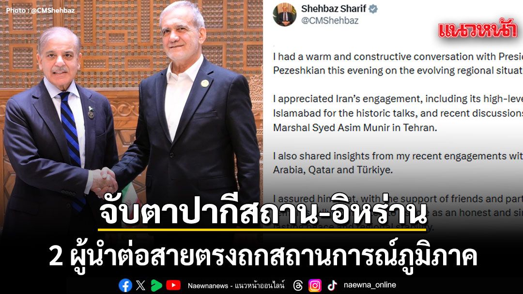 20 เมษายน 2569 สำนักข่าวต่างประเทศรายงานว่า นายเชห์บาซ ชารีฟ นายกรัฐมนตรีปากีสถาน ได้ออกมาโพสต์ข้อความผ่านโซเชียล ระบุข้อความว่า ผมได้สนทนาอย่างอบอุ่น และสร้างสรรค์กับประธานาธิบดี ดร. มาซูด เปเซชเคียน เกี่ยวกับสถานการณ์ในภูมิภาคที่กำลังเปลี่ยนแปลงไป