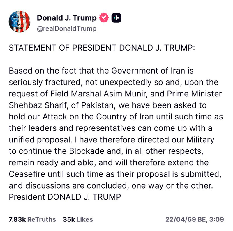 22 เมษายน 2569 สำนักข่าวต่างประเทศรายงานว่า ประธานาธิบดีโดนัลด์ ทรัมป์ ของสหรัฐ ได้ออกมาโพสต์ข้อความบนแพลตฟอร์มทรูธ โซเชียลส่วนตัว "@RealDonaldTrump" ประกาศขยายระยะเวลาหยุดยิงกับอิหร่านออกไป จนกว่าผู้นำเตหะรานจะยื่นข้อเสนอที่เป็นเอกภาพให้สหรัฐฯ ได้ โดย ระบุข้อความว่า ...