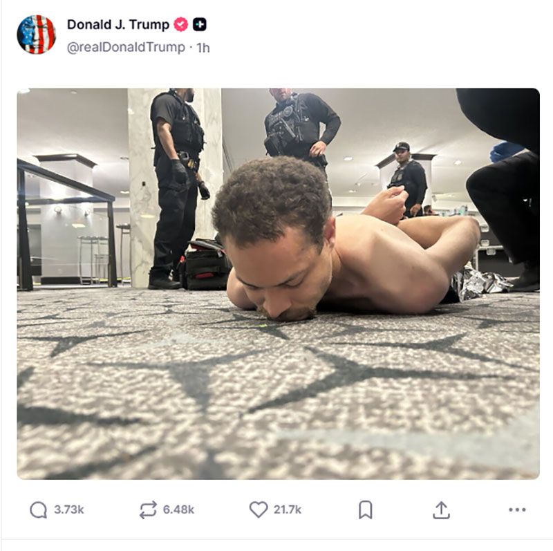 ผู้นำสหรัฐฯ กล่าวระหว่างแถลงข่าว ประณามคนร้ายเป็นอันธพาล ถือเป็นการกระทำโจมตีต่อรัฐธรรมนูญสหรัฐฯ โดยคนร้ายพร้อมอาวุธปืนหลายชนิดพยายามบุกฝ่าด่านตรวจของเจ้าหน้าที่ ก่อนถูกเจ้าหน้าที่ความมั่นคงควบคุมตัวไว้ได้ มีรายงานเจ้าหน้าที่หน่วยสืบราชการลับคนหนึ่งได้รับบาดเจ็บในเหตุการณ์ที่เกิดขึ้น เสื้อเกราะที่เจ้าหน้าที่สวมใส่ช่วยป้องกันรักษาชีวิตเจ้าหน้าที่คนดังกล่าว