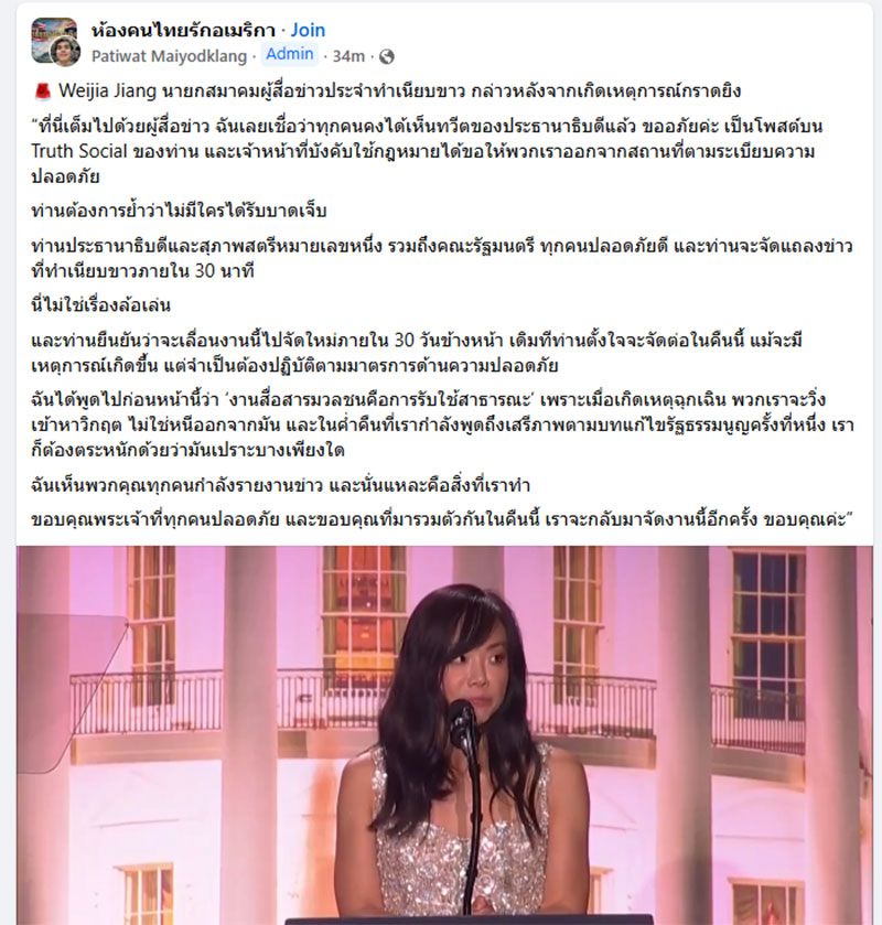 26 เมษายน 2569 กลุ่มเฟซบุ๊ก ห้องคนไทยรักอเมริกา แชร์คลิปวีดิโอในขณะที่ เหวยเจีย เจียง (Weijia Jiang) นายกสมาคมผู้สื่อข่าวประจำทำเนียบขาว กล่าวหลังจากเกิดเหตุการณ์มือปืนบุกก่อเหตุในงานเลี้ยงของผู้สื่อข่าวทำเนียบขาว เมื่อวันที่ 25 เมษายน ยืนยันประธานาธิบดีและคณะรัฐมนตรีปลอดภัย