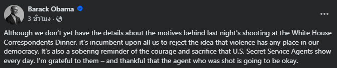 27 เมษายน 2569 จากกรณีเหตุการณ์ระทึกที่งานเลี้ยงของสมาคมผู้สื่อข่าวทำเนียบขาว ในค่ำคืนวันที่ 25 เมษายน ที่โรงแรมวอชิงตัน ฮิลตัน กรุงวอชิงตัน ดี.ซี. สหรัฐอเมริกา หลังเกิดเสียงปืนดังขึ้นภายในงาน สร้างความแตกตื่นให้กับผู้ร่วมงานจำนวนมาก