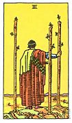 อิทธิพลของไพ่ 3 ไม้เท้า (Three of Wand) คุณจะปวดหัวกับงานที่ดูวุ่นวายมากมายแต่สุดท้ายก็จัดการได้ลงตัว และคนที่มีกิจการส่วนตัวจะไปได้ดี มีงานใหญ่ๆ เข้ามาให้ทำ ด้านความรักจะมีเสน่ห์พิเศษต่อเพศตรงข้าม แต่ให้ระวังจะมีปัญหากับคนที่กำลังคบอยู่มาก ด้านการเงินจะมีเข้ามาเรื่อยๆแม้ว่าไม่ใช่ก้อนใหญ่ ส่วนโชคลาภไม่มีเข้ามา จงอย่าริเสี่ยง เพราะได้ไม่คุ้มเสีย การเสริมดวงชะตาควรทำด้วยการนั่งสมาธิและแผ่เมตตาจะเป็นการดีกับเรา