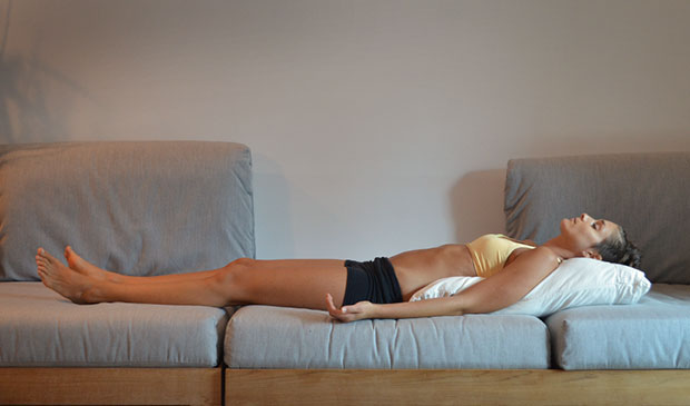 วางหมอนไว้ใต้กระดูกสันหลังตั้งแต่ศรีษะลงมาถึงช่วงเอวและเหยียดขาไปข้างหน้าจากนั้นวางมือซ้ายไว้บนหัวใจ ส่วนมือขวาวางไว้บนหน้าท้อง หายใจเข้าออกลึกๆสม่ำเสมอ 3 รอบ จากนั้นสูดลมหายใจเข้าให้นับ 1-4 แล้วกลั้นลมหายใจค้างไว้ โดยระหว่างที่กลั้นลมหายใจให้นับ 1-7 ไปด้วย จากนั้นผ่อนลมหายใจออกมาอย่างช้าๆ ระหว่างที่ผ่อนลมหายใจออกมานับให้ได้ 1-8 ทำซ้ำอีก 4 รอบ ขั้นตอนสุดท้ายนำหมอนที่หนุนหลังออก คราวนี้คุณจะนอนหลับอย่างสนิทแน่นอน