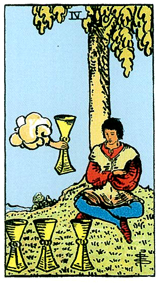 อิทธิพลของไพ่ 4 ถ้วย (Four of Cups) คุณจะสุดเบื่อหน่ายกับคนรักที่ชอบหาเรื่องทะเลาะ จนทำให้มีปากเสียงกันอยู่บ่อยๆ ส่วนคนที่เพิ่งเริ่มต้น อย่ารีบร้อนมิฉะนั้นจะแก้ปัญหาได้ยาก ส่วนการเงินอย่าคาดหวังมากนักกับคนที่ตกปากรับคำจะช่วยเหลือ ด้านการงานเดินชีพจรลงเท้า แต่ยังไม่คุ้มกับการลงแรง และคนที่คิดย้ายงานโอกาสยังไม่เหมาะสม ส่วนคนค้าขายควรรอบคอบเรื่องข้อสัญญา ช่วงนี้ควรหมั่นทำบุญทำทานกับคนด้อยโอกาสจะเสริมชะตาชีวิตเราให้ดียิ่งขึ้น
