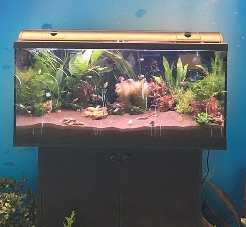 ในการนี้ พระเจ้าวรวงศ์เธอ พระองค์เจ้าโสมสวลี พระวรราชาทินัดดามาตุ ทรงจัดตู้ปลา ในคอนเซ็ปต์ “มัจฉารื่นรมย์...ดูแล้วมีความสุข” ทรงใช้พรรณไม้น้ำทั้งสิ้น 15 ชนิด ได้แก่ว่านน้ำ, อนูเบียสนานา, ผักเป็ดแดง, แอมแมนเนียแดง,ชบาน้ำ, บูเซปฟาแลนดรา, อเมซอนใบยาว, อเมซอน,แฮร์กลาส, ดาวกระจาย, ขาไก่ด่าง, โลบีเลีย,ใต้ใบแดง, สาหร่ายแปรงล้างขวด, เทปยักษ์ สำหรับพันธุ์ปลาที่ใส่ในตู้พรรณไม้น้ำฝีพระหัตถ์ จำนวน50 ตัว ประกอบด้วยสายพันธุ์ สุมาตาช็อตบอร์ดี้สีทอง, สุมาตาช็อตบอร์ดี้ ครีบยาวหลากสี, เซเป้ครีบยาวสีทอง, เซเป้แฟนซี และ เลมอนเต็ดตร้าเผือก