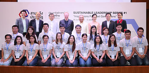 ม.ร.ว.ดิศนัดดา ดิศกุล, ฐาปน สิริวัฒนภักดี พร้อมด้วย สุทธิชัย หยุ่น, ดร.ปีเตอร์ เซงเก้, คณะผู้บริหาร และผู้เข้าร่วมเสวนา กับน้องๆ ผู้สมัครเข้าร่วมโครงการ “สานพลังเพื่อบ้านเกิด”