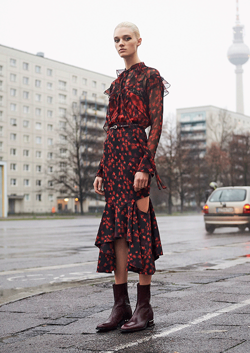 นอกจากดีไซน์และการนำเสนอความเป็นเบอร์ลินคิดส์(Berlin Kids) จะเป็นคีย์เวิร์ดสำคัญในคอลเลคชั่นนี้ ทั้งสีและลายปรินท์อันโดดเด่น ก็เป็นหนึ่งในคีย์เวิร์ดของคอลเลคชั่นเช่นกัน นอกจากสีขาวดำแล้ว สีชมพูสดและเทคนิคการเดินขอบด้วยด้ายสีทอง ก็มีให้เห็น ตลอดจนลายปรินท์ของเหล่าดอกไม้อย่าง Red Flower และการกลับมาของโมทีฟ