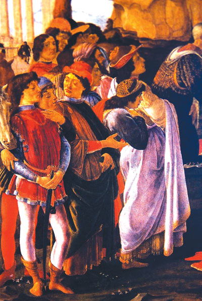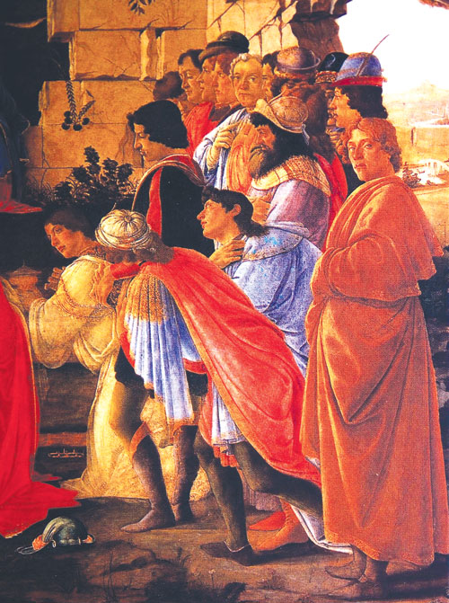 Adoration of the Magi แท่นบูชาที่ถูกเขียนขึ้นสำหรับ chapel of the broker Gasparre Lami ในโบสถ์ Santa Maria Novella นี้ ถูกเคลื่อนย้ายหลายครั้งก่อนไปปรากฏในห้องเก็บของ ของ Don Antonio de’Medici เนื่องจากภาพนี้ต้องการแสดงให้เห็นถึงความยิ่งใหญ่และมั่งคั่งของตระกูล Medici ศิลปินจึงถูกสั่งให้วาดถึงผู้มีอำนาจหลายคนของตระกูล Medici ด้วย เช่น Cosimo the Elder ก็คือ Magnus ที่คุกเข่าอยู่ใต้แทบเท้าของพระเยซู ส่วนชายที่ใส่ชุดดำทางซ้ายที่หันหน้าไปหาชายชุดแดงก็คือ Piero the Gouty ชายที่ใส่ชุดดำทางขวาก็คือ Lorenzo the Magnificent ลูกชายของ Piero ชายทางซ้ายสุดก็คือ Giuliano โดยมี Poliziano กวีพิงอยู่ข้างๆ ส่วนคนทางขวาสุดก็คือ Botticelli นั่นเอง ผลงานชิ้นนี้ Vasari นักประวัติศาสตร์ศิลป์ให้ความเห็นไว้ว่า Boticelli ได้มีพัฒนาการจนขึ้นถึงจุดสุดยอดของเขาแล้ว (ภาพจากหนังสือ Uffizi Gallery : Art History Collections)