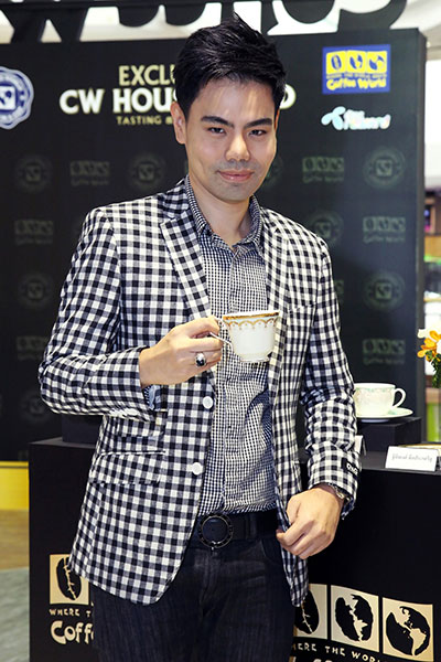 ปิดท้ายด้วยหนุ่มหล่อมาดเนี้ยบ ฐิติพงษ์ ล้อประเสริฐกุล ที่ชื่นชอบการดื่มกาแฟเช่นกัน แต่มีข้อแม้ว่ากาแฟแก้วสุดท้ายจะต้องดื่มก่อนบ่ายสามเท่านั้น“วันหนึ่งก็ดื่มหลายแก้วอยู่ครับ ตื่นเช้ามาต้องรีเฟรชเรียกความสดชื่นแล้วหนึ่งแก้ว แต่จะไม่ดื่มกาแฟหลังบ่ายสามโมงไม่อย่างนั้นจะทำให้นอนไม่หลับครับ แต่วันนี้ผู้เชี่ยวชาญด้านกาแฟของคอฟฟี่บอกว่า ถ้าเป็นกาแฟที่ชงจากสายพันธุ์อราบิก้าจะมีกาเฟอีนน้อยกว่าโรบาสต้า คงจะดื่มกาแฟได้สบายใจมากขึ้น โดยปกติจะดื่มเอสเพรสโซ่อยู่แล้ว เพราะทำรสชาติของมันทำให้รู้สึกสดชื่น สมองแล่นดีเวลาง่วงๆ อย่างวันนี้ได้ลองเอสเพรสโซ่จาก CW House Blend ของคอฟฟี่เวิลด์ชงด้วยวิธี Syphon ให้กลิ่นหอม มีรสขมและเปรี้ยวนิดๆ และความหวานติดปลายลิ้น เป็นเอสเพรสโซ่ที่พิเศษสุดๆ ถ้าชอบเอสเพรสโซ่แนะนำ CW House Blend เลยครับ รับรองว่าจะต้องติดใจอย่างแน่นอน”