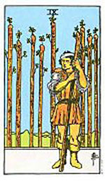 อิทธิพลของไพ่ 9 ไม้เท้า (Nine of Wands) คุณจะถูกเจ้านายเรียกไปตำหนิ เหตุมาจากการทำงานที่อืดอาดผลงานไม่ค่อยดี ส่วนคนที่มีงานส่วนตัวให้ระวังเหตุเพราะลูกน้องจะทำให้เราเดือดร้อน ด้านการเงินแม้จะมีเข้ามา แต่รายจ่ายก็มากเกินประมาณการไว้ และที่เล่นหุ้นไว้ ให้ใจเย็นๆ ในการตัดสินใจ ส่วนความรักสำหรับคนที่คบหากันมานาน คงต้องรู้จักเอาใจคนรักซะบ้าง เพราะว่าเริ่มเกิดช่องว่างอย่างมิคาดคิด และคนที่แอบลุ้นรักใครอยู่ ให้ทำใจเพราะเขามองเราแค่เพื่อน ช่วงนี้ควรทำบุญทำทานด้วยการปล่อยนกปล่อยปลาเสริมชะตาชีวิตตนเอง