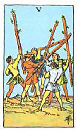 อิทธิพลของไพ่ 5 ไม้เท้า (Five of Wands) คุณที่ทำงานกินเงินเดือนจะเริ่มเครียดกับงาน เพราะมีปัญหาเข้ามาอย่างตั้งตัวไม่ติดบ่อยครั้ง และที่มีกิจการส่วนตัวให้ระวังข้อสัญญา จะทำให้เราเสียเปรียบคู่ค้า ด้านการเงินอย่าหวังเกินกับการเสี่ยงโชค เพราะจะได้ไม่คุ้มเสีย ส่วนคนที่เล่นหุ้นทิ้งไว้ พอได้เงินแต่ไม่มากมาย ส่วนความรักคนที่คบกันอยู่ ต้องเริ่มปรับตัวเข้าหากันบ้าง เพราะรักเริ่มมีปัญหา ส่วนที่เป็นสามีภรรยา อย่าไปใส่ใจกับคำพูดคนอื่น มิฉะนั้นครอบครัวจะไม่เป็นสุข และช่วงนี้ควรไปทำบุญกับคนรัก ด้วยทำบุญตักบาตรร่วมกัน