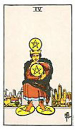 อิทธิพลของไพ่ 4 เหรียญ (Four of Pentacles) คุณจะเครียดหนักกับเงินทอง เพราะหมุนเงินไม่ทันรายจ่ายมากจนรับไม่ไหว โดยเฉพาะคนที่มีหนี้สิน จะถูกทวงถามเป็นอย่างหนัก ส่วนความรักปัญหาจุกจิกบางเรื่อง จะทำให้ปวดหัวบ่อยๆ เพราะว่ารักเริ่มมีรอยร้าว ด้านการงานสำหรับคนที่ทำงานประจำ เหมือนหยุดนิ่งไม่ค่อยหวือหวา ทำให้เซ็งสุดๆ และคนทีคิดเปลี่ยนย้ายงานมิใช่โอกาสที่ดี และงานอิสระช่วงนี้จะมีปัญหาเรื่องเงินหมุนเวียน ทำให้ธุรกิจหยุดชะงักไป ควรเสริมดวงชะตาด้วยการทำบุญบริจาคโลงศพ