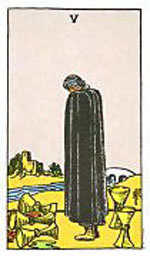 อิทธิพลของไพ่ 5 ถ้วย (Five of Cups) คุณจะเริ่มเบื่อหน่ายกับคนรัก เหตุเพราะเริ่มพูดกันไม่รู้เรื่อง ดังนั้นควรปรับใเข้าใจกันก่อนจะเเย่กว่านี้ ด้านการเงินจะมีโชคลาภเข้ามาอย่างไม่คาดฝัน ทำให้เงินทองเริ่มหมุนได้คล่องมือ แต่บางรายจะมีเหตุเสียเงิน เพราะเรื่องสุขภาพ ด้านการงานต้องนิ่งให้มาก เพราะมีคนคอยเล่นงานอยู่ สำหรับคนที่มีงานส่วนตัว กิจการเริ่มมีปัญหา เพราะบริวารทำเหตุ ช่วงนี้ควรทำบุญทำทานตามโอกาสอันควร จะเสริมชะตาชีวิตเราให้ดีขึ้น