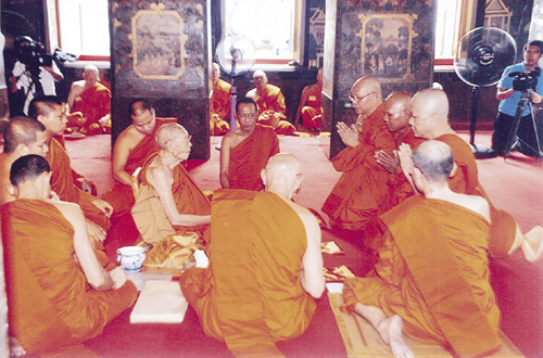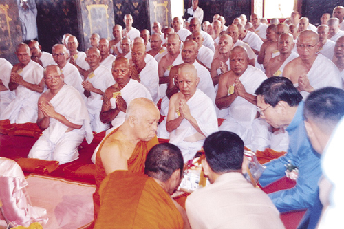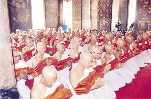พระภิกษุทั้ง 85 รูป และคณะสภานิติบัญญัติแห่งชาติ กรวดน้ำ รับพร จาก สมเด็จพระวันรัต