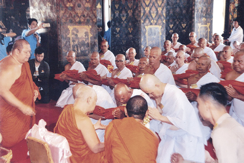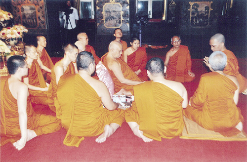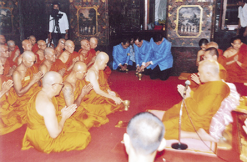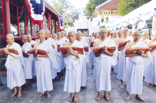 ผู้เข้ารับการบรรพชาอุปสมบทถวายเครื่องสักการะขอสรณะและศีลพระกรรมวาจาจารย์