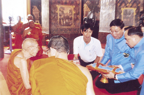 ศ.พิเศษ พรเพชร วิชิตชลชัย ประธานฝ่ายฆราวาส ถวายผ้าไตรพระราชทานและเครื่องสักการะแด่ สมเด็จพระวันรัต ประธานฝ่ายสงฆ์