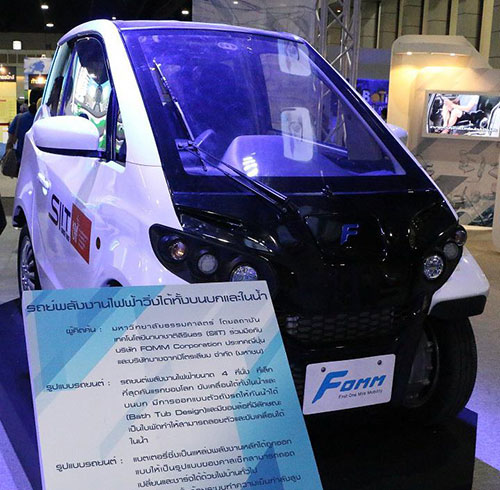 นี่คือ “รถพลังงานไฟฟ้าวิ่งได้ทั้งบนบกและในน้ำ” คิดค้นโดย สถาบันเทคโนโลยีนานาชาติสิรินธร (SIIT) บริษัท FOMM Corporation ญี่ปุ่น และ บางจากปิโตรเลียม