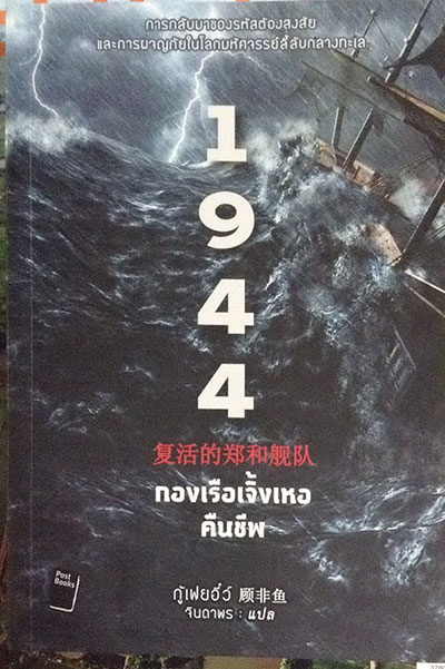 “1944 กองเรือเจิ้งเหอคืนชีพ” เขียนโดย “กู้เฟยอี๋ว์” แปลเป็นไทยโดย “จินดาพร” เป็นเรื่องราวที่กล่าวถึงสมัยเมื่อสิ้นสุดสงครามโลกครั้งที่ 2 ในค.ศ. 1944 เมื่อคณะสำรวจของจีนได้ออกค้นหา เครื่องบินทิ้งระเบิดของอเมริกาที่สูญหายไปบนเกาะร้างกลางทะเล ซึ่งเป็นบริเวณรอยต่อของเปลือกโลกสามแห่งที่เชื่อมต่อกันอยู่ จากการออกสำรวจในครั้งนี้ พวกเขาได้พบกับความลี้ลับ แปลกพิสดารบนเกาะที่ไม่มีใครรู้จักมากมาย จนยากที่จะบอกได้ว่า มันกำลังจะเกิดอะไรขึ้น เรื่องราวตลอดทั้งเล่มจึงเต็มไปด้วย การผจญภัยที่ต้องค้นหาคำตอบอันลี้ลับที่ยังไม่มีใครทราบสาเหตุ จำหน่ายเล่มละ 495 บาท