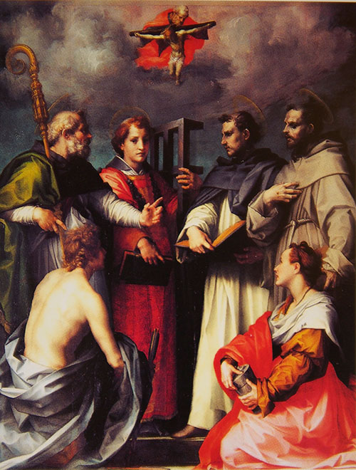 ในห้องภาพเดียวกันนี้ Andrea del Sarto ยังมีภาพเด่นอีกภาพคือ Dispute on the Trinity ภาพ St.Augustine, St.Lawrence, St.Dominic และ St.Francis ในท่ายืนร่วมกับ Mary Magdalene และ St. John the Baptist ในท่าคุกเข่านี้สะท้อนให้เห็นถึงอิทธิพลของ Raphael ต่อศิลปินค่อนข้างมาก ภาพที่ถูกเขียนขึ้นสำหรับแท่นบูชาในโบสถ์ Augustinian of San Gallo นี้ใช้สีสันสดใสร่วมกับสีโทนนุ่มปนเปกันอันเป็นผลมาจากการที่ศิลปินพยายามใช้เทคนิคของทั้ง Raphael และ Leonardo da Vinci ในการสร้างสรรค์ภาพให้กลมกลืนกันนั่นเอง (ภาพจาก The Official Guide Pitti Palace : All the Museum, All the Works)