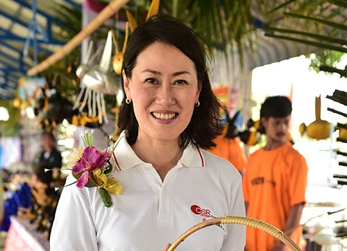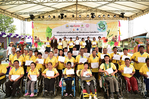 กิ่งแก้ว อินหว่าง ประธานมูลนิธิศูนย์ศึกษาและส่งเสริมกิจกรรมสังคม, ทวีป จำเนียร ผู้แทนจากพัฒนาสังคมและความมั่นคงของมนุษย์ จ.สุพรรณบุรี, บุษบา จิราธิวัฒน์, ดร.ชาติชายนรเศรษฐาภรณ์ ผู้บริหารกลุ่ม เซ็นทรัล ไพวรรณ พลวัน รองอธิบดีกรมส่งเสริมและพัฒนาคุณภาพชีวิตคนพิการร่วมกันโชว์พืชผลเศรษฐกิจ