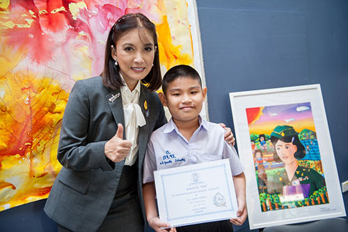 ศิรเวท ศุขเนตร มอบรางวัลให้แก่ ด.ญ.ภาวิศา อยู่เกิด ผู้ชนะรางวัลยอดเยี่ยมผลงานจิตรกรรมภาพวาดพระสาทิสลักษณ์ “เจ้าฟ้าในดวงใจ”