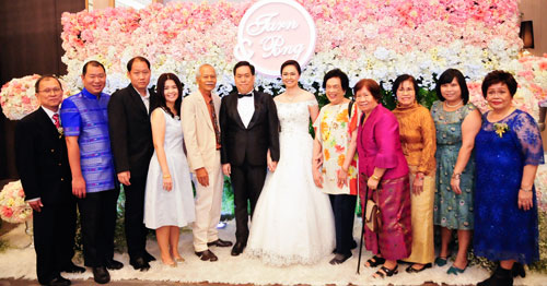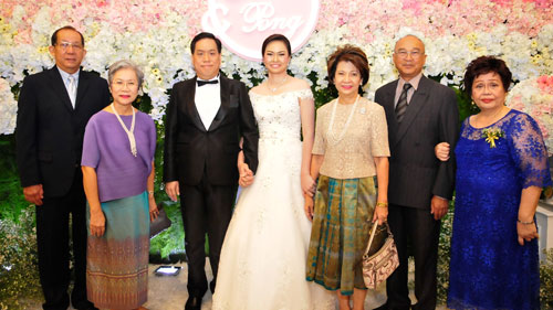 คุณพ่อ-คุณแม่ฝ่ายชาย นพ.มนตรี-ฉวีวรรณ และเครือญาติ ร่วมอวยพรมอบให้คู่บ่าว-สาว