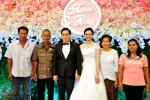 บรรยากาศในงานตกแต่งด้วยดอกไม้สวยงาม มีมุมแกลเลอรี่ของคู่บ่าว-สาว บอกเล่าเรื่องราวความรักของทั้งคู่ตามสถานที่ต่างๆ ให้แขกเหรื่อได้ชื่นชม นอกจากนี้ยังมีพร็อพน่ารักๆ ไว้สำหรับถ่ายภาพอีกด้วย เมื่อเข้าสู่พิธี ประธานในงานขึ้นกล่าวอวยพร จากนั้นบ่าว-สาว นำเค้กมงคลมอบให้แทนคำขอบคุณแก่คุณพ่อ-คุณแม่ และผู้ใหญ่ที่ให้เกียรติมาร่วมแสดงความยินดีในงาน
