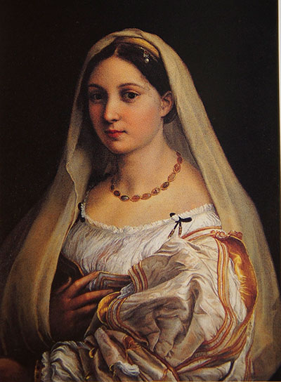 Portrait of a Young Woman (1516) ภาพผู้หญิงในผ้าคลุมผมสีครีมนี้ ไม่มีใครทราบว่าศิลปินใช้ใครเป็นนางแบบ แต่นักวิจารณ์ศิลป์รุ่นใหม่เชื่อกันว่าเธอคือ La Fornarina หรือคู่รักลึกลับของ Raphael หญิงสาวที่ศิลปินเขียนในช่วงจุดสูงสุดในวิชาชีพของเขานี้แสดงให้เห็นถึงพัฒนาการในการวาดภาพจากที่เขาเคยได้รับอิทธิพลมาจาก Florentine School แต่เพิ่มส่วนของความเป็นงานประติมากรรมเข้าไปด้วยสังเกตได้จากสีหน้า แววตา และท่วงท่าที่ดูสงบเยือกเย็นแต่อุดมไปด้วยความสดชื่น ยิ่งกว่านั้นสายตาที่จ้องมองมายังผู้ชมราวกับกำลังค้นหาบวกกับความงามของใบหน้านี้ยังสะท้อนให้เห็นถึงความงามเดียวกันกับ The Sistine Madonna ที่ปัจจุบันจัดแสดงอยู่ที่เดรสเดนเยอรมันด้วย เป็นไปได้ว่านางแบบมาจากคนเดียวกัน