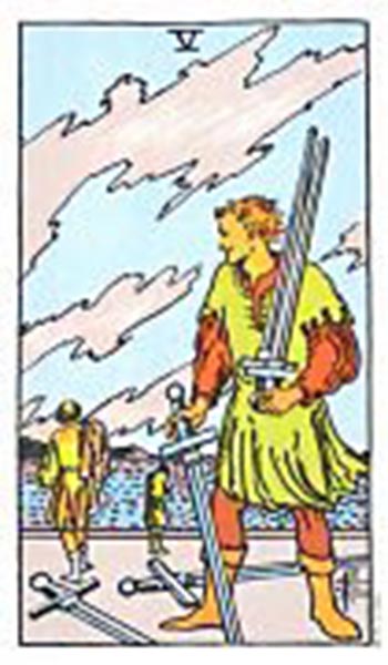 อิทธิพลของไพ่ 5 ดาบ (Five of Swords) วันนี้จะเครียดจัดเพราะโดนเพื่อนร่วมงานแทงข้างหลัง เล่นเอาเซซ้งสุดๆ ความรักมีปัญหาเหตุเพราะแนวคิดไม่ตรงกัน เงินทองของมีค่าที่หายไปให้ทำใจ เพราะยากจะได้คืน