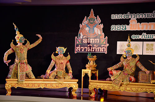 ทั้งนี้ ภายในงานแถลงข่าวได้รับเกียรติจาก นางสุนันทา มิตรงาม รองอธิบดีกรมส่งเสริมวัฒนธรรม, ดร.สิริชัยชาญ ฟักจำรูญ อธิการบดีสถาบันบัณฑิตพัฒนศิลป์ พร้อมด้วยคณะกรรมการโขน อาทิ อาจารย์สุดสาคร ชายเสม ผู้ออกแบบฉากและอุปกรณ์ประกอบฉากประกอบการแสดง, ดร.อนุชา ทีรคานนท์ ผู้ช่วยผู้อำนวยการผลิต, ดร.สุรัตน์ จงดา ผู้ช่วยผู้อำนวยการผลิต, อาจารย์เกิดศิริ นกน้อย ผู้ช่วยผู้กำกับการแสดง ฯลฯ มาร่วมงานแถลงข่าวในครั้งนี้ พร้อมร่วมชมการแสดงไฮไลท์ของปี ชุด “ขับพิเภก” ภายในงานอีกด้วย