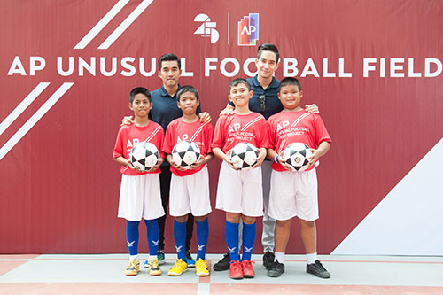 สองผู้บริหารเอพี ภัทรภูริต รุ่งจตุรภัทร และ สรรพสิทธิ์ ฟุ้งเฟื่องเชวง นำทีมส่งมอบสนามฟุตบอลและอุปกรณ์กีฬา