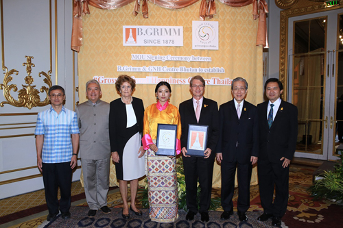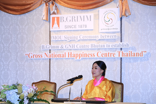 ในการนี้ เจ้าหญิง อาชิ เคเซง โชเดน วังชุก ประธานศูนย์มวลรวมความสุขประชาชาติ ประเทศภูฏาน (Centre Bhutan : GNH Centre Bhutan) ได้มีพระดำรัสว่า GNH Centre Bhutan ก่อตั้งขึ้นในรัชสมัยของ สมเด็จพระราชาธิบดี จิกมี ซิงเย วังชุก เมื่อปี 1972 ด้วยทรงมีพระราชปณิธานที่จะทรงสร้างสภาวะเพื่อความเป็นอยู่ที่ดีและความสุขของประชาชนชาวภูฏานในโลกที่มีการเปลี่ยนแปลงอย่างไม่หยุดนิ่ง ซึ่งปัจจุบัน สมเด็จพระราชาธิบดี จิกมี เคเซอร์ นัมเกล วังชุก ทรงสืบสานพระราชปณิธานแห่งสมเด็จพระราชบิดา โดย GNH Centre Bhutan มุ่งเน้นการพัฒนาความสุขให้แก่ประชาชนอย่างรอบด้าน และผสานค่านิยมดังกล่าวไปสู่องค์กรภาคธุรกิจ การที่ค่านิยม “ความสุขมวลรวมประชาชาติ” ถูกเผยแพร่ไปนอกประเทศภูฏานเป็นสิ่งที่น่ายินดี ซึ่งประเทศไทยเป็นประเทศแรกที่อยู่ในใจเนื่องจากมีความใกล้ชิดกัน และกลุ่มบริษัท บี.กริม เองก็เป็นองค์กรธุรกิจที่มีแนวคิดเดียวกันกับ GNH Centre Bhutan ความร่วมมือในการก่อตั้ง GNH Centre Thailand จึงนับว่าเป็นการเริ่มต้นเป็นตัวอย่างให้กับชาติอื่นๆ ที่องค์กรธุรกิจหันมาให้ความสนใจในการสร้างความสุขมวลรวมประชาชาติควบคู่ไปกับการพัฒนาประเทศในด้านต่างๆ อันเป็นการสร้างความสุขและการพัฒนาที่ยั่งยืน