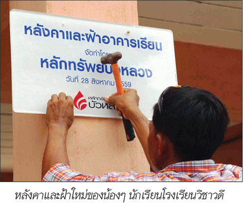 ด้วยเหตุนี้ทางหลักทรัพย์บัวหลวง จึงได้เชิญชวนพนักงานจิตอาสาร่วมแบ่งปันเพื่อไปช่วยเหลือน้องๆ โรงเรียนวิชาวดี โดยจัดทำหลังคา ฝ้าอาคารเรียนให้ใหม่ทั้งหมด พร้อมทั้งจัดเวทีกิจกรรมให้ด้วยเพื่อให้น้องๆ ได้มีกิจกรรมการแสดงในวาระต่างๆ นอกจากนี้ยังได้มอบอุปกรณ์การเรียน อุปกรณ์กีฬา เครื่องดนตรี และเงินช่วยเหลือให้ครูใหญ่ไว้ใช้จ่ายดูแลโรงเรียน และน้องๆ